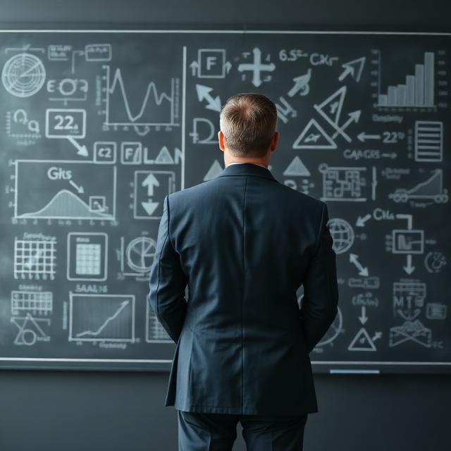 A man in a professional dark suit seen from behind, standing in front of a large chalkboard covered in complex financial charts, diagrams, and mathematical equations.